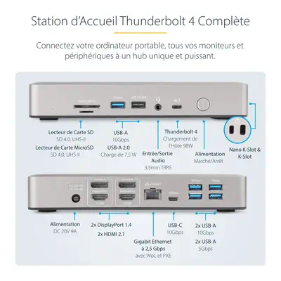 Transformez un ordinateur portable Thunderbolt 4 en une station de travail multi-moniteur haute résolution avec 7x ports USB, un port Ethernet 2,5 Gigabit, un port audio 3,5 mm, ainsi que l'USB Power Delivery et le chargement des appareils en avalCette station d'accueil certifiée Thunderbolt 4 utilise un seul port Thunderbolt 4/3 ou USB4 sur un ordinateur hôte pour ajouter une connectivité haute performance tout en chargeant l'ordinateur portable.Vidéo Haute Performance Flexible prenant en charge jusqu'à quatre écrans 4K à 60 HzLa station d'accueil est équipée de 2 ports HDMI et 2 sorties vidéo DisplayPort pour connecter plusieurs écrans à l'ordinateur hôte. La station d'accueil offre une flexibilité vidéo, prenant en charge des configurations d'un; deux, trois ou quatre écrans. Avec un processeur Intel de 12e génération ou supérieur prenant en charge DP 1.4 avec DSC, la station d'accueil peut prendre en charge une configuration à quatre écrans avec des résolutions allant jusqu'à 4K à 60 Hz. Des affichages quadruples sont également disponibles à des résolutions ou des taux de rafraîchissement inférieurs sur les ordinateurs sans DSC ou avec des révisions Intel antérieures. De plus, la station d'accueil prend en charge un affichage unique 8K à 60 Hz sur l'un des ports de sortie HDMI.Les ordinateurs Apple équipés de processeurs M1, M2 ou M3 Max/Pro prennent en charge deux écrans. Pour les ordinateurs Apple dotés du processeur de base M1, M2 ou M3, un seul écran est pris en charge.Connectivité des PortsLa station d'accueil utilise le débit élevé de 40 Gbps disponible à partir d'un port Thunderbolt 4/3 ou USB4 pour fournir une large gamme de connectivité de ports adaptée à diverses applications.La station d'accueil comprend :• 2 ports HDMI pour connecter des écrans• 2 ports DisplayPort pour connecter des écrans• 6 ports USB 3.2 (3x Type-A 10 Gbps, 1x Type-C 10 Gbps, 2x Type-A 5 Gbps) pour connecter des périphériques USB• 1 port USB 2.0 (480 Mbps) de type A prenant en charge BC 1.2 avec 7,5 W (1,5 A) pour charger des périphériques USB alimentés par batterie• 1 port Ethernet 2,5 Gigabits avec amorçage PXE et WoL pour se connecter à un réseau local câblé (LAN)• 1 lecteur de carte Secure Digital (SD) 4.0/UHS-II pour accéder externe aux cartes mémoire SD, SDHC et SDXC• 1 lecteur de carte micro Secure Digital (microSD) 4.0/UHS-II pour accéder externe aux cartes mémoire mSD, mSDHC et mSDXC• 1 prise audio TRRS 4 positions de 3,5 mm pour connecter un casque de 3,5 mm98W de Puissance de Livraison USB CertifiéeComprend un adaptateur secteur de 180 W et prend en charge la livraison de puissance USB de 98 W. Cela permet à la station d'accueil de charger l'ordinateur portable, avec suffisamment de puissance supplémentaire pour que le port USB 2.0 aval prenne en charge BC 1.2 avec 7 W (1,5 A) pour charger des tablettes, des smartphones ou d'autres périphériques USB alimentés par batterie.Améliorez la Productivité et la Gestion des Appareils avec l'application StarTech.com Connectivity ToolsDéveloppé pour améliorer les performances et la sécurité, Connectivity Tools est le seul ensemble logiciel sur le marché compatible avec une large gamme d'accessoires de connectivité IT. Le logiciel comprend :•Utilitaire Avancé de Disposition de Fenêtres Windows : pour configurer et sauvegarder des mises en page de fenêtres personnalisées.•Utilitaire de Transfert d'Adresse Mac : pour améliorer la sécurité du réseau.•Utilitaire de Surveillance d'Événements USB : pour suivre et consigner les périphériques USB connectés.•Utilitaire de Commutation Automatique Wi-Fi : permet aux utilisateurs d'accéder rapidement à des vitesses réseau plus rapides via un LAN câblé.Pour plus d'informations et pour télécharger l'application StarTech.com Connectivity Tools, veuillez visiter : www.StarTech.com/Connectivity-Tools```The StarTech.com Advantage