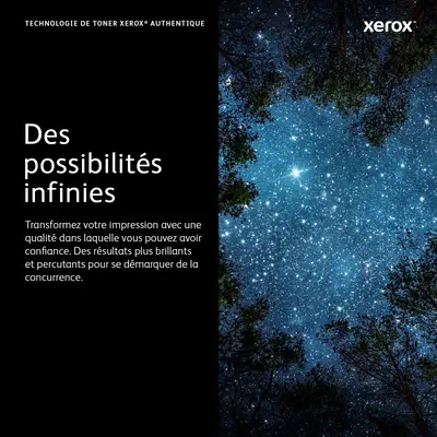 - FIABILITÉ : Les toners compatibles peuvent entraîner des pannes, des couleurs médiocres et réduire les rendements à la page. Veuillez effectuer vos impressions avec des toners de marque Xerox pour des résultats précis, des couleurs éclatantes et des bords nets
